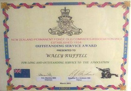 In February 2003, an Outstanding Service Award was presented to Wally Ruffell (artillery historian and stalwart of the New Zealand Permanent Force Old Comrades' Association for decades) by Brigadier Ray Andrews, Colonel Commandant of the RNZA and Patron of the Association.