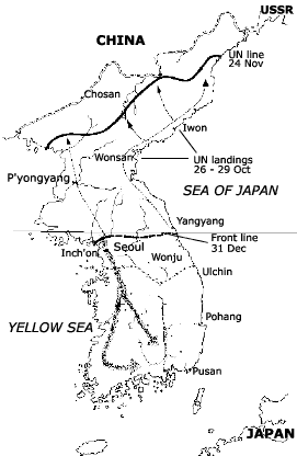 Operations: June 1950 - January 1951. Hashed area: North Korean advance Jun - July Dotted line: Pusan Perimeter July - September x-x : Front line 24 January