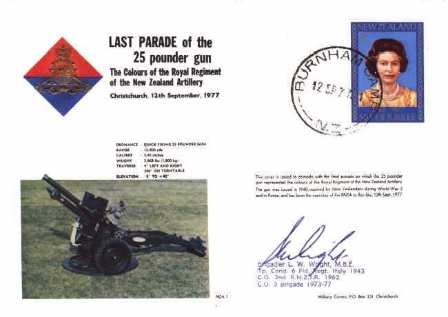 Card reads: This cover is issued to coincide with the final parade on which the 25 pounder gun represented the colours of the Royal Regiment of New Zealand Artillery. The gun was issued in 1940, manned by New Zealanders during World War 2 and in Korea, and has been the mainstay of the RNZA to this day, 12th Sept., 1977.