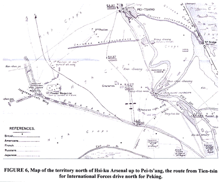 All of these groups meeting up at the railhead some 10 miles from Tien-tsin. At daybreak on the 23rd June 1900 these forces, less the group led by Bower, advanced toward Tien-tsin with the Russians moving along the railway and to the right, and the British, American and Italians moving to the left, then within 6 miles of Tien-tsin they met heavy Chinese resistance and came under heavy fire. But the attack moved steadily forward until the last bridge was reached before entering the settlement and it was here that they met the most resistance but with the use of American field-guns, the bridge and the entry to the settlement and Tien-tsin, see plan of Tien-tsin in Figure 5, was won.