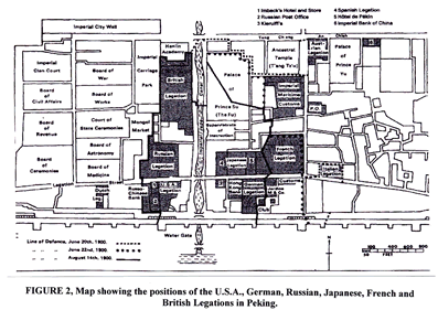 The Foreign Ministers met and unanimously agreed that they would not move from Peking, In order to delay this ultimatum they sent a letter to the Tsung-li Yamen requesting a meeting on the 20th but received no reply. On the morning of the 20th June the German Minister, Baron von Ketteler, with his interpreter set out for the Tsung-li Yamen in 2 sedan chairs. Having travelled only a short distance from the Legation, Baron von Ketteler's chair was stopped by a member of the Imperial Army who shot the German Minister dead. At 4.00 pm that afternoon the Chinese opened fire on the Legation Quarters, these quarters are shown in plan in Figure 2. The legation was ably defended by the troops who had come up from Tien-tsin under the general command of the British Minister.
