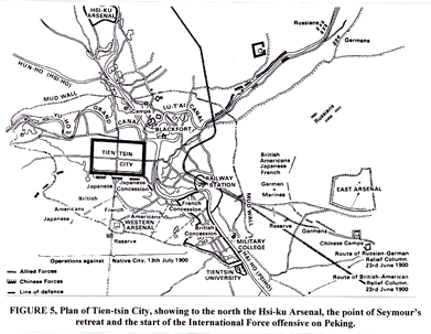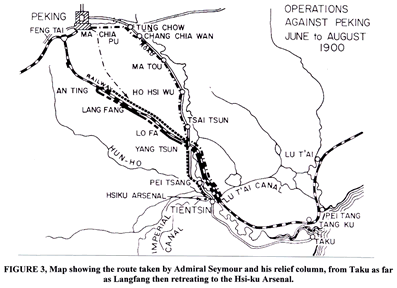 Good news, on the 18th July when the Japanese Minister received a message, that had got through Chinese lines, from Tien-tsin stating that 'a combined Allied relief column of about 12,000 men was preparing to march to Peking', this news brought great relief to the Foreign Ministers in the Legation Quarters. Before continuing from here we should go back to Admiral Sir Edward. H. Seymour's attempt to bring a relief column to Peking, see Figure 3.