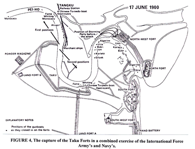 Whilst the situation at Peking was becoming critical other towns in Chi-li province were a cause for concern, the Chinese section of Tien-tsin had been taken by the Boxers and the Legations their were under threat, as were the railway towns of Tong-shan, Pei-tai-ho and Shan-hai-kuan. It was learnt by Rear-Admiral Bruce that Chinese troops were heading to Tang-ku and the Taku forts, a council of international naval commanders was called on 14th June and again on the 16th June, and a decision was made to occupy the Taku forts, the British Commander C. Cradock of H.M.S. Alacrity took ashore a landing party made up from all of the nations present 321 British, 244 Japanese, 159 Russians, 133 Germans, 25 Italians and 22 Austrians, some 904 officers (35) and men (869). They advanced at night with half of the British, Japanese, Germans and Italians in the front line, with the remaining British, Russians and Austrians bringing up the rear. The ships bombarded the forts from the Pei-ho, see Figure 4 for a plan of this attack, but little damage was done in the dark, at dawn Cradock got his troops under cover and the forts were again bombarded by the ships from the river and by 4.30 am the guns of the fort were silenced. The attack on the North-West Fort was resumed; the final charge was sounded upon which the Japanese raced the British for the West Gate the two nations scaling the defences together. Commander Hattori, of the Japanese Navy, was one of the first up the parapet and upon turning to assist Commander Cradock was shot dead, the gate of the inner fort was soon forced open and this attack completed.