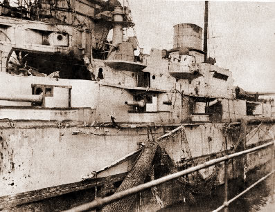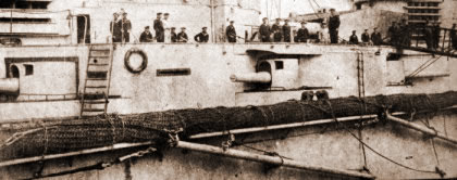 With the improved (lower) main deck net shelves and booms stowed along the side of the ship, 'Out Nets' became an evolution which could be performed in an astonishingly short time, the nets being dropped and swung out into position on their 30 ft booms in 10 seconds and refurled, with the aid of steam powered windlass, onto the shelves in a minute. The record times which were even less, were recorded in the VENERABLE in 1905. However these times should be viewed with some scepticism as they would be achieved through some highly unorthodox priming. Times of 2-3 minutes are more likely to have been achieved in action. But the coming of the torpedo with a net cutter fixed in its nose posed a serious threat. Net cutters to deal with the heaviest mesh were of (1) the pistol type evolved by the French, which discharged automatically upon hitting the net, and (2) a scissors type as used on Japanese torpedoes to cut the net. The former worked well enough experimentally, but did not score much success under realistic conditions. The closer mesh of the later nets apparently defeated the scissors cutter, to such an extent that both in the German and Royal Navy's heavy nets were regarded as more or less torpedo proof. Elsewhere opinion as to the utility of nets varied between nations. France discarded nets; the Russians fitted them in some ships and not in others; for a short time they were carried in the Italian DUILIO and ITALIA classes; and the Americans ignored them never adopting this form of defence. During the Russo-Japanese war nets were used effectively in only one instance, namely, in December 1904 by the battleship SEVASTOPOL. That vessel, at the end of the siege of Port Arthur, was anchored outside the harbour in a position where she was sheltered from the fire of the Japanese batteries, but became exposed to persistent attacks from torpedo-boats. She was lying near the shore and had her nets out along both sides and an extra net around the bow, but the stern was left unprotected. Two destroyers were assigned the duty to ward off enemy attacks in the region between the ship and the shore, and two smaller torpedo-boats were stationed near the ship, one each side. Land batteries co-operated in the defence. From 11th to 16th December SEBASTOPOL was exposed to numerous night attacks. The Japanese employed no less than 30 torpedo-boats, of which two were lost, and it was estimated that altogether 104 torpedoes were fired against the ship. Most of the torpedoes missed or remained hanging in the nets, where several of them exploded, but the nets were repaired in the daytime. One torpedo, however, which exploded in the nets near the bow, produced a leak in the torpedo room, and another damaged the compartment forward of the collision bulkhead, the nets having yielded to such an extent that the explosion took place near the hull. The ship settled by the bow. The two last torpedoes that struck the ship were fired at close range against the unprotected stern: they damaged the rudder and produced a serious leak under the quarterdeck, so that the aft end of the ship sank until it touched the bottom. The leak was repaired, the ship again floated, and finally, on the last day of the siege, she was take out to deep water and sunk. The nets did good service in this case, but it must be admitted that the circumstances were exceptional. The Japanese in peace time had practised steaming with nets out, but did not do so during the war. They gained practically no experience in repelling torpedo attacks owing to the lack of Russian enterprise, but after their attacks on the Russian ships at Port Arthur the inadequacy of partial net defence was realised. Japanese battleships carried the same sort of protection as the RN, and through about 60° of arc the nets gave no protection whatever; for another 100° or so they only slightly reduced the size of the target, and should the broadside be turned to an attack so as to get the benefit of the maximum length of net defence, the maximum of risk was invited by the offer of the unprotected ends. In the flagship MIKASA an extension of the crinoline around the bows and stern was temporarily fixed, but later discarded. No reports of nets having fouled screws were received. By the time of DREADNOUGHT in 1906 it was said that the torpedo net defence, devised by Captain Bacon, was the most elaborate and complete system fitted to a warship to that date, yet needed only 2 or 3 minutes to drop the nets from a stowed position. The net defence ran for three-quarters of the length of the ship along the upper deck level. The weight of the entire installation was about 100 tons. In 1907 advances in the propelling engines of Whitehead torpedoes doubled the available propelling power of the torpedo and adding about 10 kts to the maximum speed which for the first time was to give them sufficient punch to penetrate net defences. The days of the torpedo net were numbered. Provision for anti-torpedo nets within the Royal Navy's capital ship designs continued until 1911 when the KING GEORGE V class (1910 Estimates) were the last to enter service with anti-torpedo nets fitted, and although they were provided for the succeeding class of IRON DUKES (1911 Estimates), they were only fitted to IRON DUKE during her trials period and were removed before she commissioned. Nets were discarded in all following designs. Those already fitted in ships were progressively removal from all class but some were retained as late as 1916, even though it was accepted by then that they were of limited value except for moral and as a seamanship evolution to keep ship's company's well drilled. By the outbreak of WW1 torpedo nets had disappeared from all but German and British Navies where they could still be found on many capital ships. At the beginning of the Gallipoli campaign in spring 1915 the pre-dreadnought battleship GOLIATH was torpedoed and sunk by the Turkish torpedo boat MUAVENET whilst engaged in shor