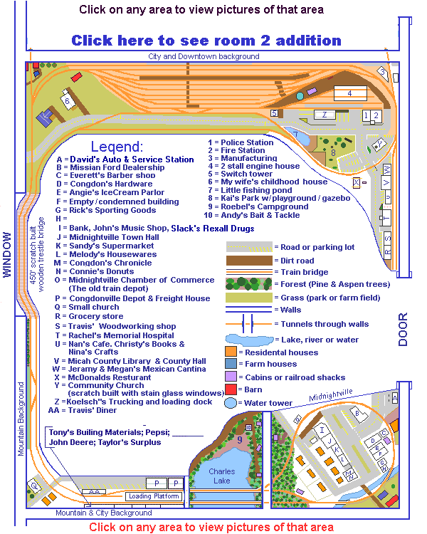 Most buildings, businesses, Streets, Rivers & Lakes are names after family or close friends. I do a little at a time. I don't work on one section until it is done but work on a section for a little while then move onto another section. Some sections are more done then others. I have expanded my layout into the next room tunneling through the wall and am making it into a canyon with the tracks going along the river. This canyon is called Rock Canyon. The town of Midnightville is named after a black cat named Midnight that we had. The longest train I have ever ran on my layout is 4 Atlas engines (Santa Fe freight - blue & yellow), 40 different box cars ranging from a 35' car to a 70' refer car, and one Atlas Santa Fe caboose. Running my passenger train at about scale speed of 60mph it take almost 4 minutes to go around the layout, 70mph little over 3 minutes.