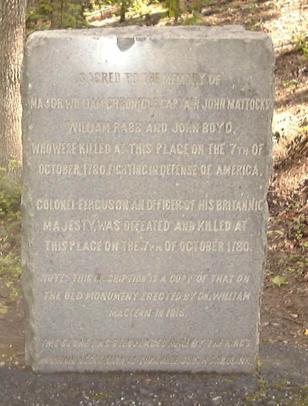 Major William Chronicle's Monument This monument marks the spot where Major William Chronicle, from Lincoln County North Carolina, was killed during the battle. Major Chronicle and Captain John Mattocks had previously provided vital information concerning the site of Ferguson's camp to the American Forces. The two men had maintained a deer hunting camp on the mountain during the previous autumn.