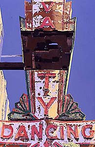 Born and raised in Warren, MI, a town just north of Detroit, Domka first discovered her talent for the technique at Wayne State University, where she received a degree in fine arts. She started out coloring 8 x 10 prints, and then moved onto larger ones. Today, the average print she works with is 20 X 24, a size which she told Photographic magazine, allows her to "really dig into details" (Photographic magazine, March, 1999 issue). Her technique is fairly simple: Domka begins by shooting the subject in black and white film, usually with a 35mm Nikon SLR camera. The photo is printed on a matte-finish, fiber-basted paper and then dry-mounted on archival museum board. The edges are next masked-off with artist's Frisket in order to keep the borders clean. Then comes the fun part: adding the color. Domka primarily uses Prismacolor art pencils, which allow her more control over the image. However, she also uses oil paints for more subtle color transitions, such as in cloud scenes. When adding color, Domka often uses a color print of the subject as a frame of reference. Her true talent however, is in the way she envisions color where it previously did not exist, and she uses much freedom in achieving the vibrancy and richness of color that her prints are most known for. Finally, the prints are sprayed with a fix, which both protects the piece, and intensifies the color. Domka, who is currently employed full-time as a photo research archivist at General Motors, comes from a long line of GM employees. So it is not surprising that one of her favorite subjects is old cars. Many of her prints include images of white or light-colored vintage cars from the 1950s, which she has re-colored in the magentas, greens, electric yellows and aquamarines the decade is most known for. However, Domka also enjoys shooting vintage neon signage, some of the results of which are shown below. Domka's work has been displayed in galleries, featured in magazines and