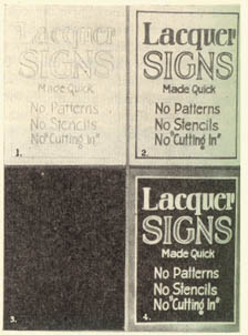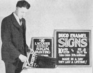 I have just described the simplest way of making the simplest lacquer sign. But any design, no matter how complicated, can be reproduced in lacquer. The rapidity with which the material dries makes it possible to use many colors on one sign where that is desired. Lacquers are much more uniform and dependable than they were a few years back and the new sign lacquers automatically overcome most of the troubles that we originally experienced. Just as in oil painting, the best materials are none too good. Use the best sign lacquer and the best spray gun you can get and you will have very little trouble. Perhaps we have make a mistake in the past by placing too much stress on the mistakes and troubles to be avoided, thus making the lacquer system seem complicated. So, to avoid a repetition, I shall simply say that lacquer is easy to apply. It is more beautiful, and more durable than any painted sign and less time is required to produce it. Any sign man will find that he can learn to use this new material successfully in a small fraction of the time it took to learn card writing or sign painting. And you will be justly proud of your lacquer signs. No cutting-in, no brush marks and no waiting for the sign to dry - what more could you ask? Try it out. Home | News | Exhibits | Events | Links | Talk | FAQ | Contact Us |