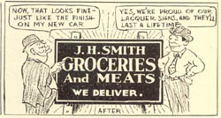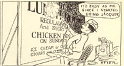Why Lacquer Is Coming To The Front Today there are any number of good gum lacquers on the market, intended especially for sign work. When dry these are less brittle than the auto finishing lacquers, and hence far better for sign purposes. The greatest improvement of all, in my estimation, is the good, durable clear lacquer made by the Atlantic Chemical Company. Lacquer signs are apt to grow dull, after a few months, unless they are polished. A coat of good durable clear lacquer eliminates this trouble. All of the other clear lacquers I have tried were less durable than the colored lacquer. Now many shops are giving their signs a coat of clear lacquer. This is not necessary on trucks as the regular washing and polish of the machine keeps the signs bright and lustrous. Last fall I was in Los Angeles and visited Al Vaughn, the inventor of Lackermask, at the Voquett & Vaughn Studios. There I saw lacquer signs of all sizes up to forty feet long, being made in the most approved way. A helper coats the background with a spray gun, then the sign painter letters on the small stuff and outlines the large lettering, leaving the helper to fill in with "mud" (Lackermask) on the large work. Dozens of coated signs were piled on the racks. When the final coat is dry the sign is thrown on the wash rack and may be washed under pressure at any time, from a few hours to a week after the work is done. Most of the signs are made on Galvannealed metal, although wallboard is sometimes used. The metal is framed first, and the molding, which has been painted with oil color, is tacked in the corners or on the face after the lacquer sign is completed. The quality and finish of the work is far superior to anything produced with paint and all the irksome labor of cutting-in is avoided. In a short article, it is impossible for me to go into full details about the lacquer system; but there are a few advantages and stunts of real importance that I would like to mention. One is regarding the method of applying lacquer. The proper way to apply the material is to first fog on a very light coat and let it dry a few minutes before applying the regular coat of lacquer. This should be done with the primer, white coat, all colors, and the clear lacquer finish. The fog coat makes the primer stick better; the white fog coat keeps the primer from bleeding into the white; a fog coat of the background color over the lackermask keeps the color from blowing through the masking paste; and finally, a fog coat of clear lacquer, blown on lightly before the full finishing coat, will prevent the colors from running together or "bleeding" into the clear lacquer. Learning to blow on this light fog coat, with the gun held some distance from the work, will eliminate most lacquer trouble. It causes the mask to wash off easier and prevents all trouble from bleeding colors. Another problem simply solved is the removal of the masking paste without water pressure. Of course, high pressure is preferable, but you can wash the signs with an ordinary hose and a stiff bristle brush. A stiff one-inch brush with a strip of tin bound tightly around the bristles, leaving about a quarter of an inch of the stock exposed and used like a putty knife or scraper, will remove all the mask from the finished sign without any trouble or injury to the lacquer. A power auto washer with a two-horse electric motor will develop three hundred pounds of water pressure, and is ideal for washing lacquer signs. Such a machine costs a little over $200. For the gun you will require an outfit that will maintain a pressure of sixty pounds or more while in use. I have seen several equipped with a quarter horse power motor that worked very well. The larger outfits are better. The little cheap outfits are not adaptable to lacquer spraying. I have used quarter horse power outfits quite successfully, and I would recommend an outfit selling at about $100 complete in preference to anything cheaper. Most of the larger size outfits are good, but the smaller portables usually will not maintain sufficient pressure to carry gun lacquer. A good airbrush stunt, which was explained by Al Vaughn, is to thing fat oil size about half and half with gasoline and then use the lacquer gun to spray this on wood letters that are to be gilded. This gives a perfectly even coat of size all over the letters and insures a beautiful burnish. From the sign painter's viewpoint the greatest advantages of lacquer are the speed with which it can be handled, the elimination of all cutting in, and the fact that all brush work is done with one medium; no washing of brushes and changing from one color to another. From the customer's viewpoint the greatest advantages are the beauty equal to baked enamel in both respects--in fact less brittle than the enamel--and small signs can be delivered the same day they are ordered, if necessary. Home | News | Exhibits | Events | Links | Talk | FAQ | Contact Us |