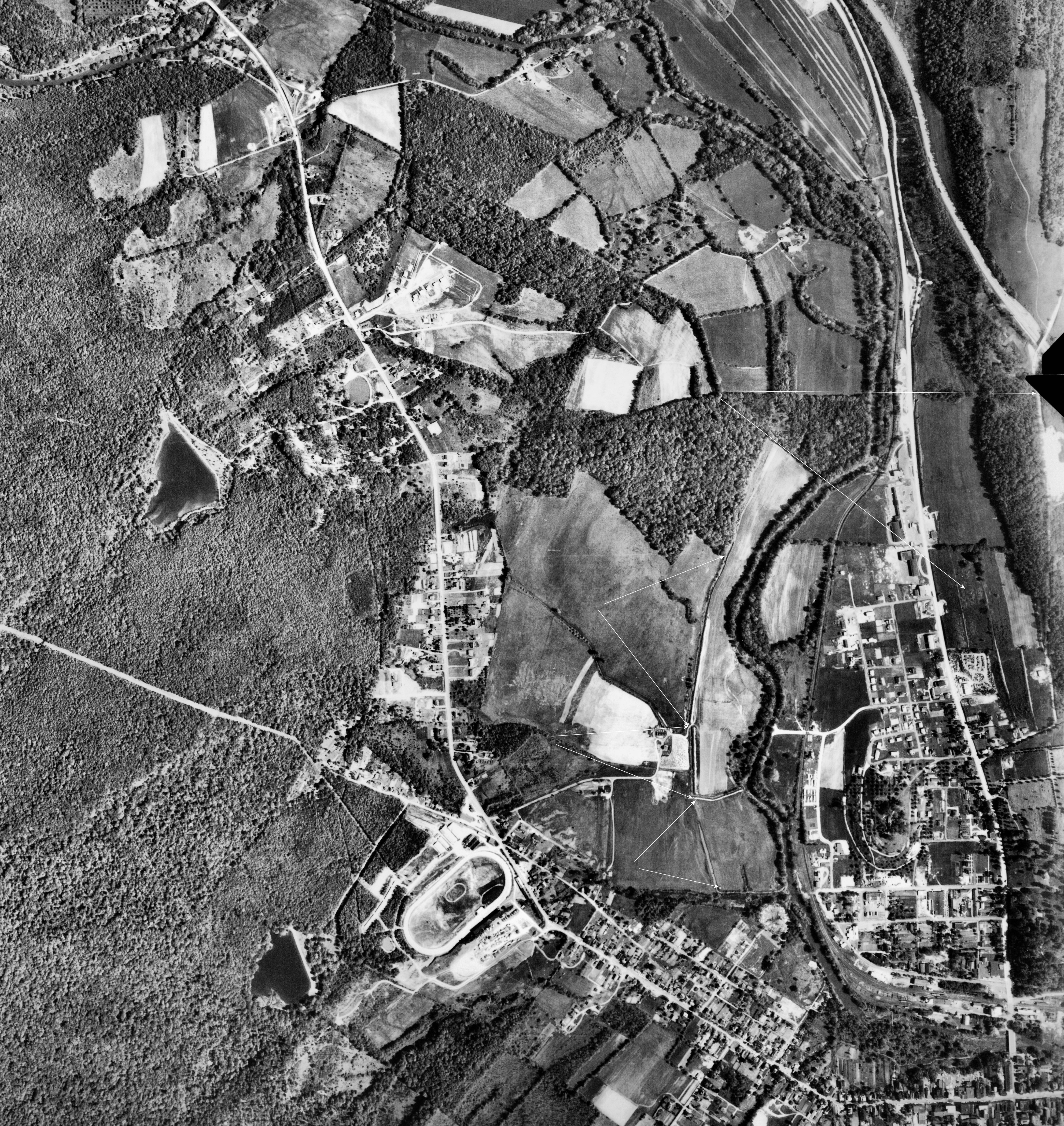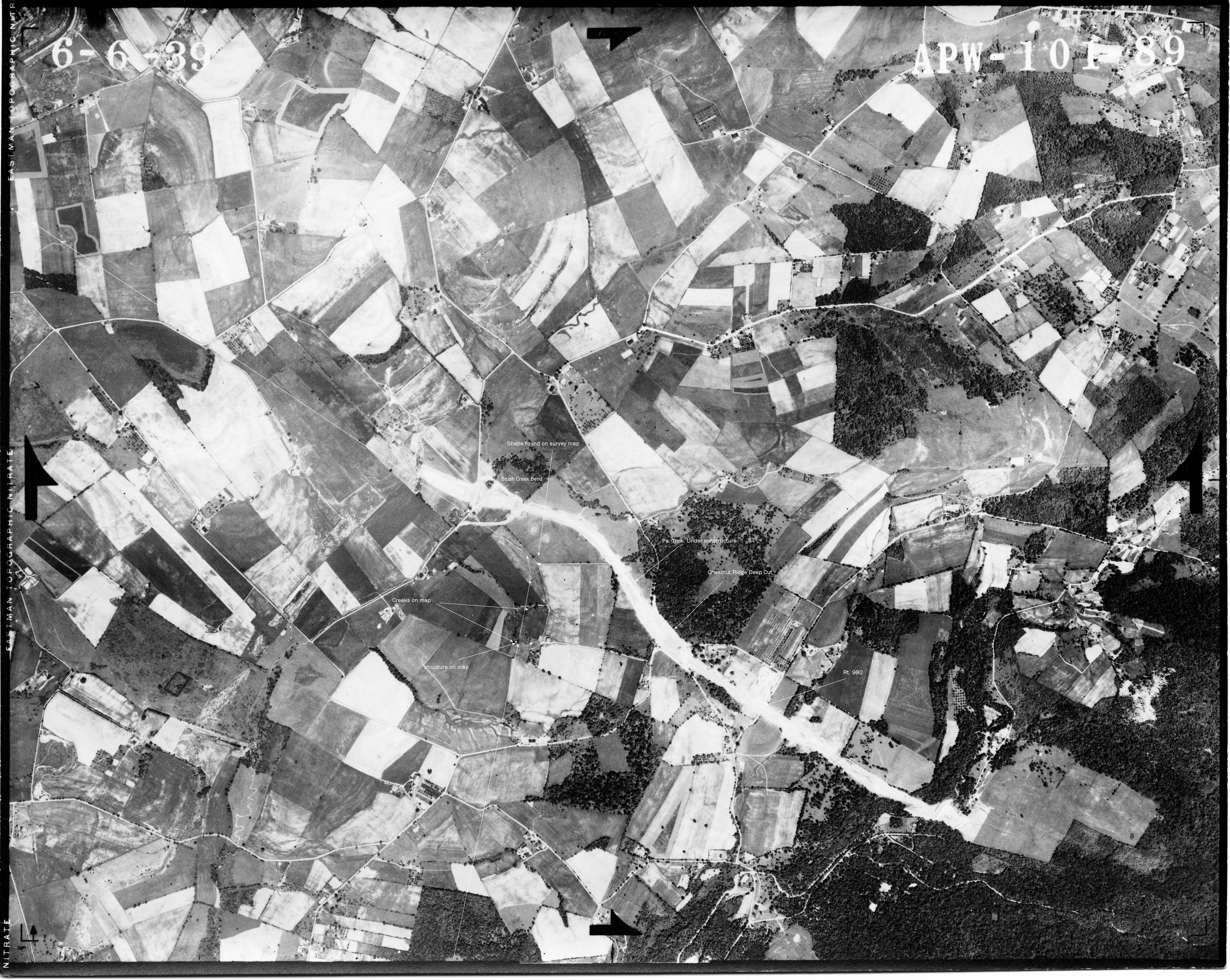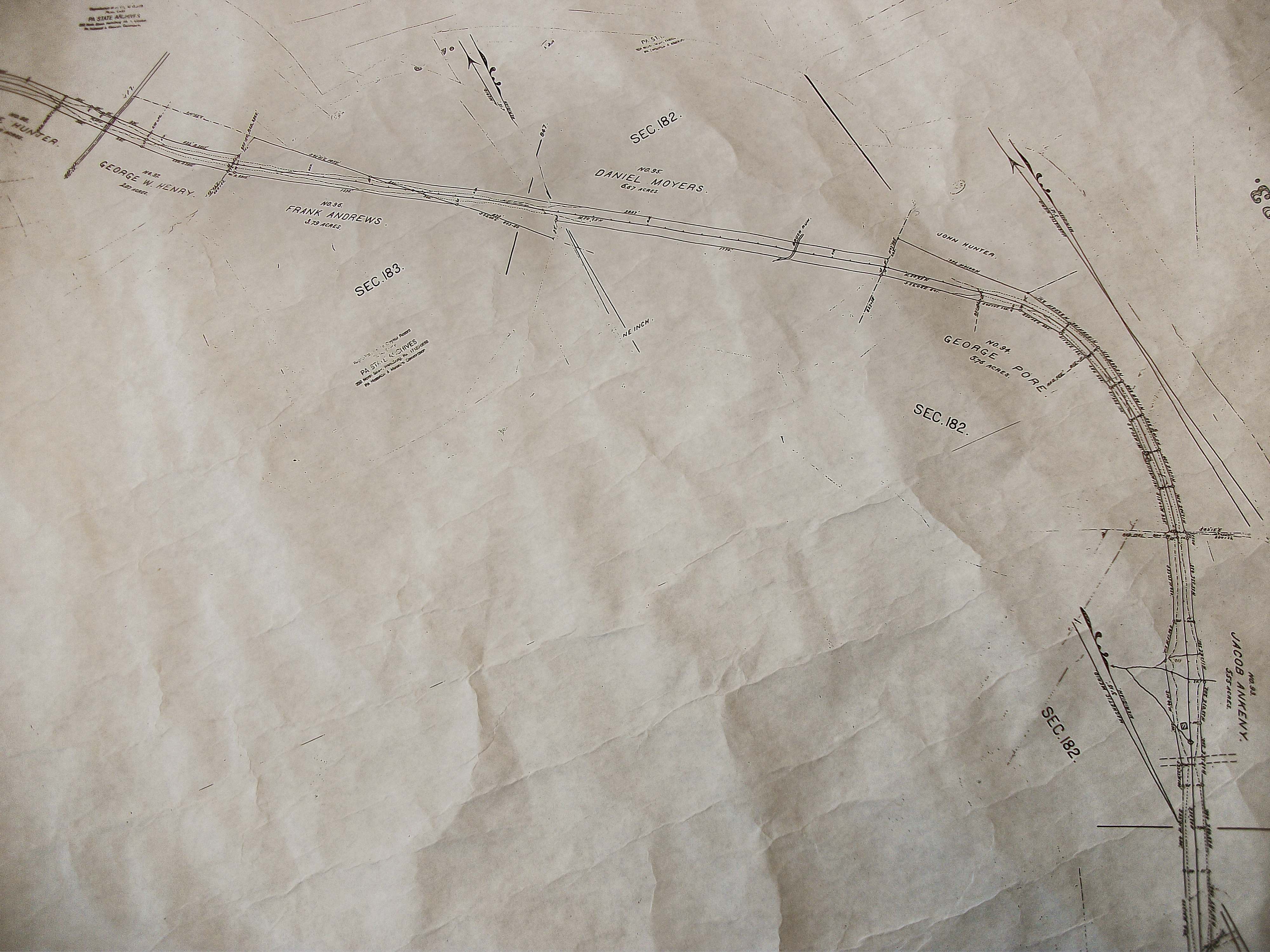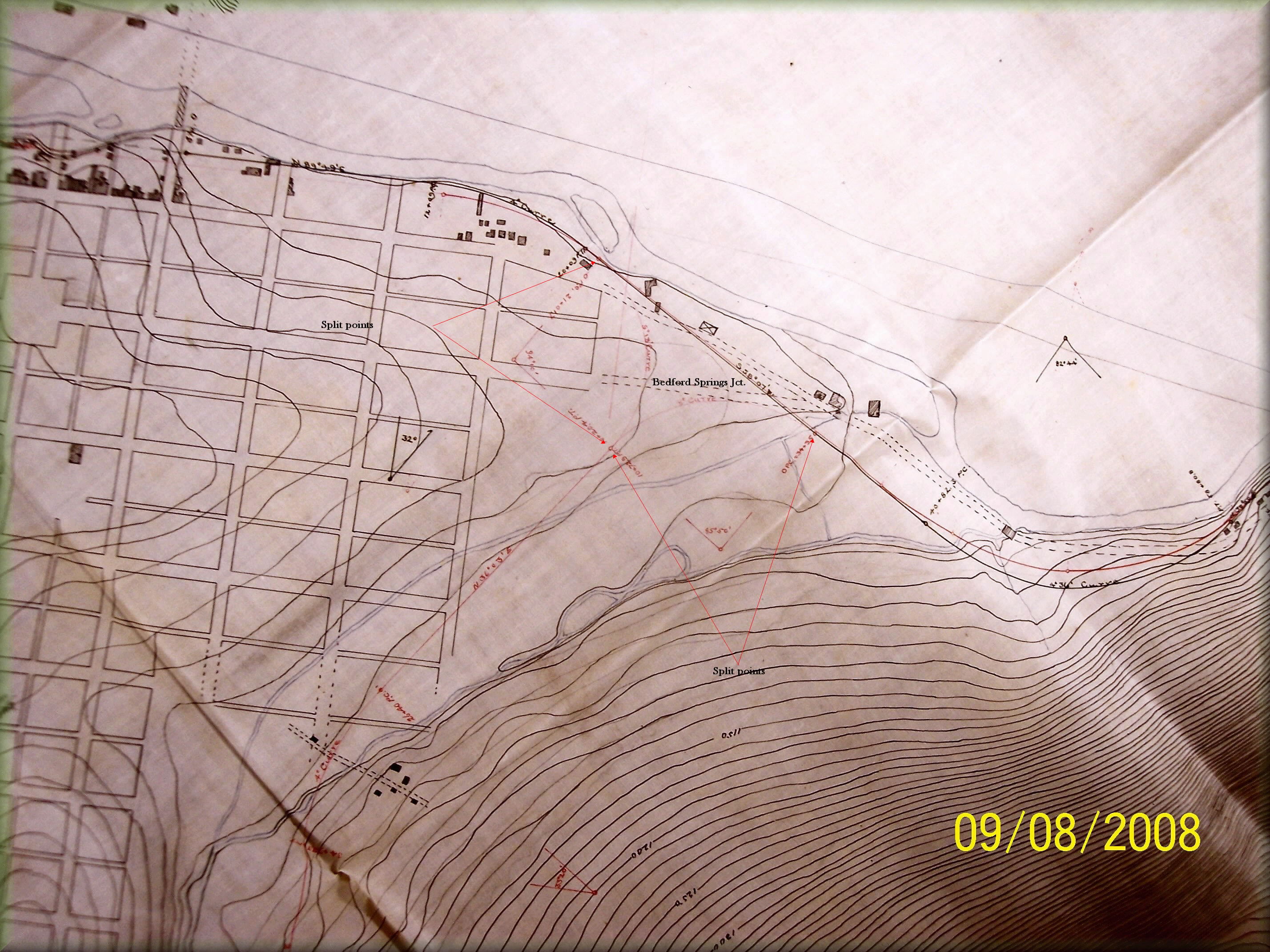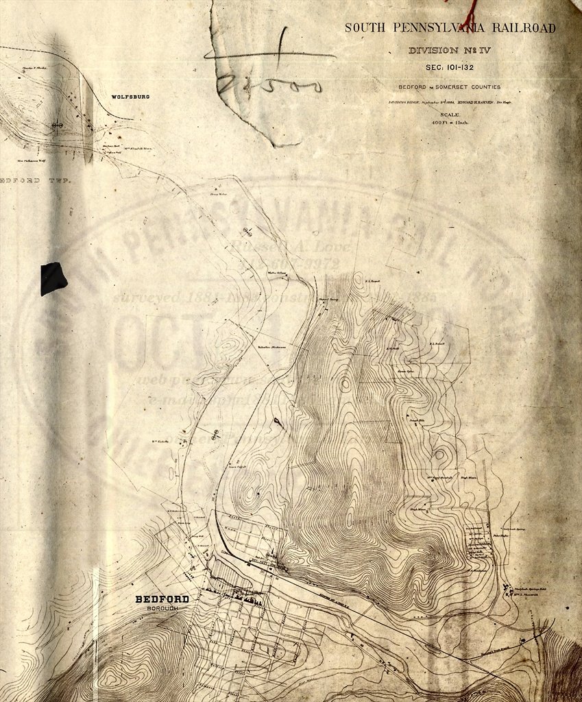 Chestnut Ridge Upper & Lower loops My present focus is locating the right of way down the Chestnut Ridge just west of Donegal. I recently found a landmark on aerial photos which show that I was not locating the railroad in its correct location. I have since found a few more landmarks that show where the alignment should have been built. ![]() Here is a map showing the final landing off the Chestnut Ridge showing at the bottom right hand corner the Ankeny farm with its creeks and one of the creeks exiting the log cabin. Just to the north the grade curves west crosses the only bend in Brush creek and continues straight to/through the Moyer's and Andrews property where you can see on the south end the property line still evident today. That property line is a tree line and is a dead giveaway as to where the railroad should be and my belief is that it is along the south shoulder of the Pennsylvania Turnpike. Notice on the outside curve another property line which can be seen to this day and that boundary also reveals where the railroad would be on today's as well as in the past aerial photos that exist. Here is the whole route that never got built or started in the Chestnut Ridge looking north. ![]() Finding this exact location needs a fly over view. Oh Wait! someone did that already. A June 6th 1939 aerial view of the Chestnut Ridge. Some of the landmarks found on the maps made by the railroad are indeed found on the landscape. ![]() Possible west side of Bedford work Bedford is one of those sites that I keep coming back to. It may seem strange but every time I pass over the intersection of I-99 and route 30 just west of the town I am drawn to focus at the area of the I-99 ramp going north as well as the north bound lanes and keep thinking that is South Penn ground. ![]() This next piece of aerial map shows what appears to be railroad grading along the west bank of the Juniata River just as it appears on the map above. The problem is that parts of I-99 are on top of the site in question. Time to look for culverts. ![]() Bedford Springs Hotel, Bedford Pennsylvania It was once explored that a line to and through the famous historic Bedford Springs Hotel south of Bedfordd was to have the South Pennsylvania Railroad reach and service this site. ![]() Below: You can see on this South pennsylvana Railroad map of the east end of Bedford how a wyw was to be built to access the Bedford Springs Hotel resort. ![]() Phenomenal! |