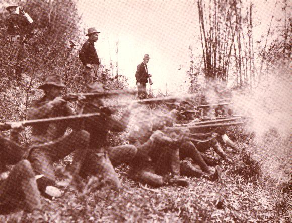 While trench warfare had been continuously going on between the Spaniards and the Filipinos all along the line on the outskirts of Manila, the American troops had not taken part in any of these scraps until the night of July 3lst, when, during a torrential rain the Spaniards opened up a galling fire on the American trenches. The American troops retaliated, and what was probably the greatest battle ever fought between the Spaniards and Americans was fought that night. A number of lives were lost on both sides including an American Captain of the First California Regiment. As this was the first and only time that the Spaniards had opened fire on the American trenches, it was assumed that the Spanish outpost must have become confused and reported that the American troops, using the darkness and rain as an advantage, had left their trenches and were advancing. This was not true as the American troops had received no orders to leave their trenches that night.