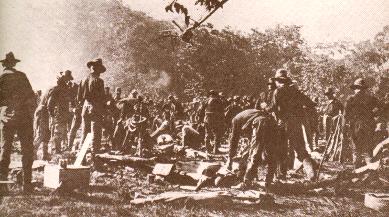The next day was spent in helping to unload supplied from the transports. On June 27th, the Ninth finally took up their line of march toward Santiago. The unit made four miles that day, the men laboring in the intense heat, carrying their blanket rolls and ammunition. That night the regiment camped at Sevilla.