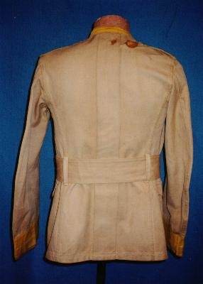 The uniform is a private's uniform since it bears no signs of having had rank insignia attached to the collar or shoulders. It is early issue and has the additional unofficial branch service facing color on the pocket flaps, plus the original cotton drill belt supplied with the blouse.