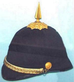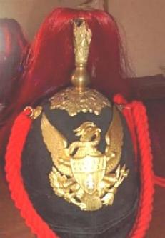 The Model 1881 Dress Helmet was worn only for full dress events. The helmet evolved from the earlier Model 1872 helmets worn only by the Cavalry, Light Artillery and Signal Corps. In 1881, the new helmet design was adopted for use by all enlisted troops and for officers of the Infantry, Cavalry and Artillery. (General and Staff officers continued to wear a chapeau de bra as they had for many years...) For enlisted troops, the helmet was made of black felt, while officers could buy a helmet of black cloth over a cork or felt base. Atop the helmet of all mounted troops is a brass plume holder, resting on a brass base having an oak leaf and acorns motif, while the plume holder itself is engraved with an eagle and star. For enlisted men, a thin rod with two circular plates at the top clamps the base of the horsehair plume and rests atop the plume holder, while officers had a similar device to let the plume appear like it was fountain sprung from their heads . The plume's color depended on the branch of service the soldier was in: white for mounted Infantry officers, red for Artillery and yellow for Cavalry.