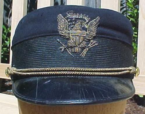 The Model 1895 Officers' Undress Hat is made from dark blue wool, lined in polished cotton, 3.5" high with 1.5" wide black mohair braid sewn between two 1/8" welts around the hat. This was one of two hats authorized for all officers, worn in garrison or in the field. The Arms of the United States was embroidered on the front of the hat, and, along with a simple gold adjustable cap strap, was the only ornamentation allowed. For use in hot weather, an all-white version made of cotton drilling was authorized for wear without any form of ornamentation.