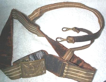 The Junior Officers Dress Sword Belt uses the Model 1872 Officers Belt Buckle, featuring a nickle-plated wreath surrounding the Arms of the United States. The belt has a black leather "base" with an outer "skin" of colored silk grosgrain, in white for Infantry, yellow for Cavalry, red for Artillery and black for all other corps, overlaid by four evenly-spaced 5/16" gold braids. The scabbard bands are similar to the pattern of the belt, differing only in length and width, each with a brass snap hook to attach to the scabbard of the officer's sword. The standard sword for all dismounted officers was the Model 1860 Field and Staff Officers Sword. Mounted Infantry and all Cavalry officers used the Model 1872 Light Cavalry Saber.