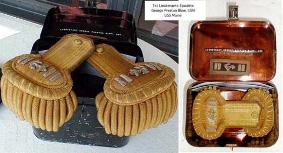 Below is a view of Lieutenant George P. Blow's dress epaulets. Blow served as an officer aboard the USS MAINE and survived the explosion that destroyed her in the harbor at Havana, Cuba.