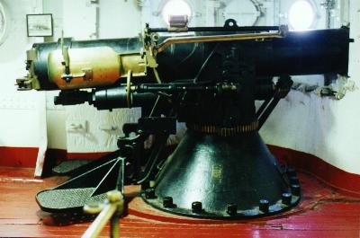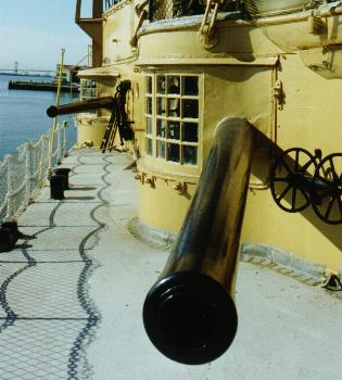 These were to workhorse guns of the OLYMPIA at the Battle of Manila Bay. Unlike the eight inch guns, which were difficult to aim and slow to fire, the five inch guns could, in theory fire a fifty pound shell over seven times a minute! At a range of nearly five miles, the shell would penetrate nearly two inches of armor! Each of the five-inch guns had a horizontal range of fire (azimuth) of 113 to 116 degrees. The gunports could be opened to allow for an unobstructed turning radius.