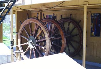 will see a set of three large, interconnected ship’s wheels. These wheels,