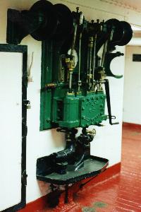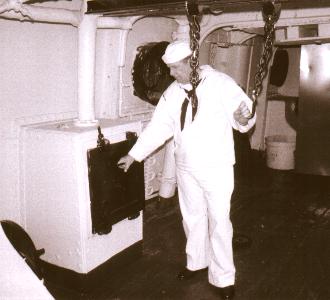 Periodically throughout the space, the visitor will note shafts with narrow doors. These are the ash hoists. Nearby are the controls that were used to raise the buckets of ash up from the boiler rooms to the berth deck, a trip that took five seconds. The large buckets, each weighing three hundred pounds when loaded, were taken from the shafts and placed on a chain and hook which was slid along an overhead rail leading to the outer hull of the ship, where the ash dumps are located. Each ash dump serves two ash hoists.