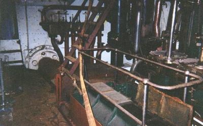 The impression of the engine room can almost not be conveyed by words. The machinery (and virtually every inch is taken up by machinery, piping, etc.) is a combination of strict functionalism and artistry. There are two engine rooms, each containing one engine. Each engine is a triple expansion engine, about 29 feet in length and close to 20 feet tall. In addition, the space includes a condenser, major steam lines, and smaller auxiliary equipment. On the main engines, the piston heads are surrounded on the sides by a layer of tongue and groove stained wood as are the major steam lines.The largest of the engine's three pistons is 92 inches in diameter! One of the triple expansion engines was capable of generating nearly 9,000 horsepower. The British had claimed that the OLYMPIA was overengined, but this never seemed to be the case.