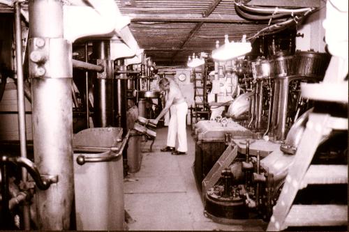 Working in the engine room, when it was in operation, must have been a challenge...and a real safety hazard! Live steam would leak into the space, and boiling water would drop from the pipelines overhead onto the men. Smoke from lubricating oil would also fill the air (depending on how much oil was used on any given watch). The noise of the engines was tremendous when the ship was moving at battle speed of 21 knots, and making close to 140 revolutions per minute. In action, the men could only make themselves heard to one another by yelling. Of course, the men serving in areas such as the engine room had little knowledge of what was going on topside during a battle. They had to hope, pray, and rely on the sparse information that was given to them.