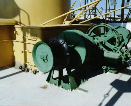 The visitor will see several items of interest in this area. Moving forward, passed the engine hatch, and two steam winches. The steam winches had a variety of uses. They could be used to aid in the raising of the OLYMPIA’s sails, which were seldom used, and also to raise and lower the vessel's cutters and boats. More importantly, the winch would have been used to raise containers of coal to fill the always-hungry coal bunkers.
