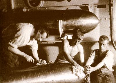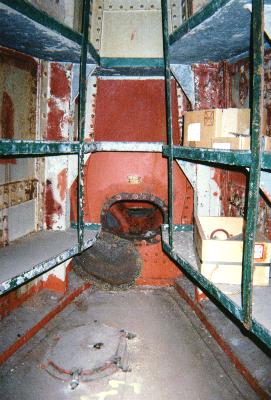 In the forward torpedo room, the remains of the forward tube can be seen. This tube can also be seen from the exterior, as a round protrusion on OLYMPIA's bow.