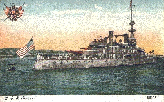 At the outbreak of the War, OREGON was transferred from the Pacific Coast to the waters off Florida. The 14,700 mile cruise, under the command of Capt. Charles Clark, was done with the utmost speed, but still took sixty-seven days. The ship did not even put into port when a coal bunker was discovered to be on fire adjacent to a magazine. The race of the USS OREGON around South America and through the stormy Strait of Magellan to join the Atlantic Fleet was closely followed by the American public. The voyage was of the factors that drove home the need for a canal linking the Atlantic to the Pacific Ocean.