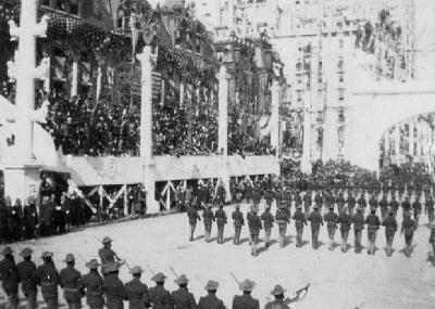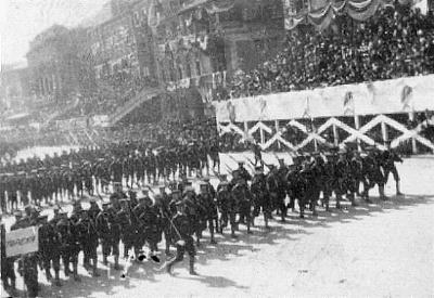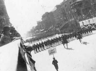 Many of the troops were brought into the city strictly for the parade, including many encamped at Camp Meade, in Middletown, Pennsylvania. For many of these men, it was not a pleasant experience. They were brought by train to the city, through the heavy rains, quartered in some old factory buildings, and given very little to eat. They marched in the parade, along a seven mile route, and passed under the Athenean Arch, and past the Court of Honor. Here the President and others, including Shafter and Lawton, watched in review. Following the parade, the troops were quickly taken back out of town. One member of the 8th Pennsylvania composed a song (sung to the tune of “When Johnny Comes Marching Home”) which read in part: