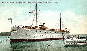On the June 6, 1898 bombardment of Santiago, the REINA MERCEDES received thirty-five hits, though protected by the hills near the harbor entrance. Two of the shells started fires, including a particularly bad fire in the forward paint locker. While directing the fire fighting actions, Commander Emilio Acosta y Eyermann was hit by a shell which took off his right leg at the hip and his right hand, horribly mutilating him. He said "This is nothing.....Viva Espana!" before he died. Acosta y Eyermann became the first Spanish Naval officer to die in the War.