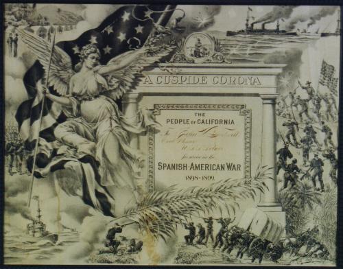 This certificate was awarded to John Vance Tidwell, a coal passer aboard the SOLACE. It reads "A CUSPIDE CORONA/The/People of California/John V. Tidwell/Coal Passer/U.S.S. Solace/Spanish American War/1898-1899."