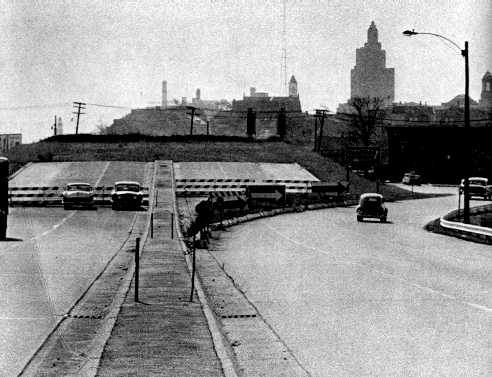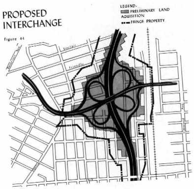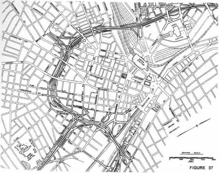 Original 1947 plan for downtown freeways. Note the ghost ramps to the west, south of where US 6/RI 10 currently ties in.