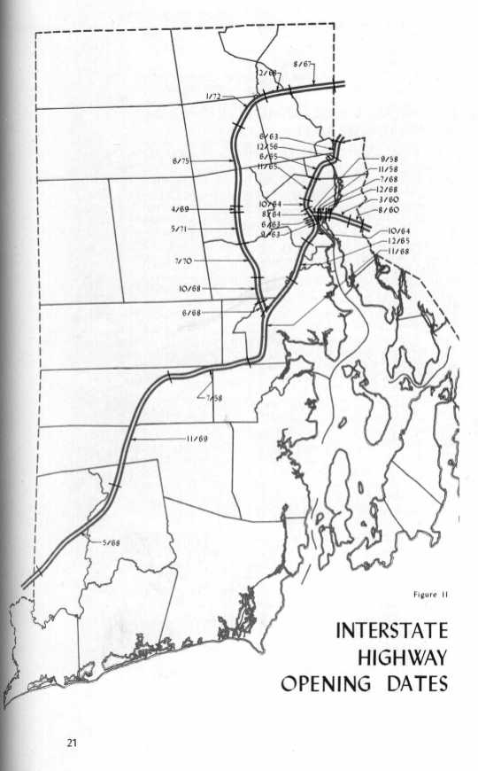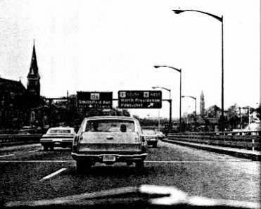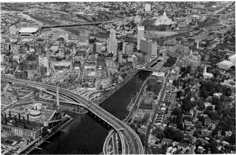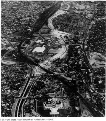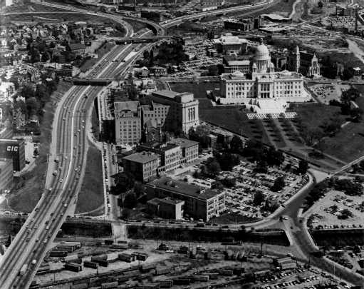 A view of downtown from the north. The circle is visible just past the Capitol. Also note the ramps where exit 20 (US 6/RI 10) is now.