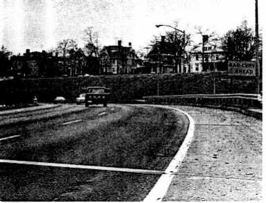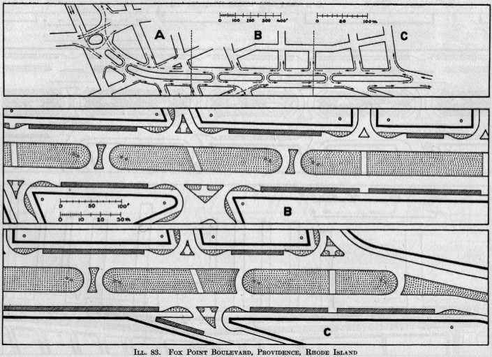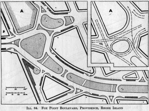 Original configuration of Fox Point Blvd (now I-195 between exits 2 and 3) and 1935 plans to redesign it under the "steadyflow traffic system". Closeup of the west end.