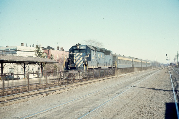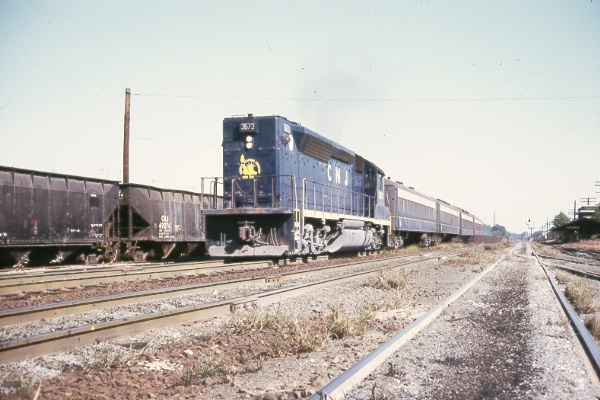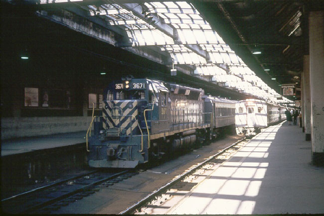 3671, RDC cars, 3675 and repainted 5910 at Newark Penn Station. CNJ mainline trains generally used track 5.