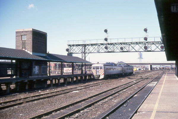 Various 'scoots' stopping at the Elizabethport station. The east-west mainline was crossed by the Newark branch to the north and the line south to Perth Amboy, later commonly known as the Chemical Coast secondary.
