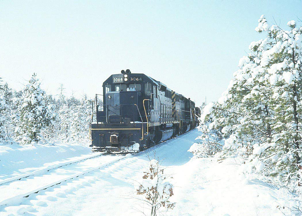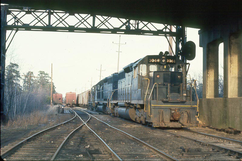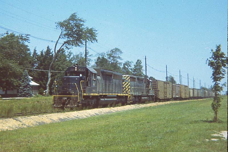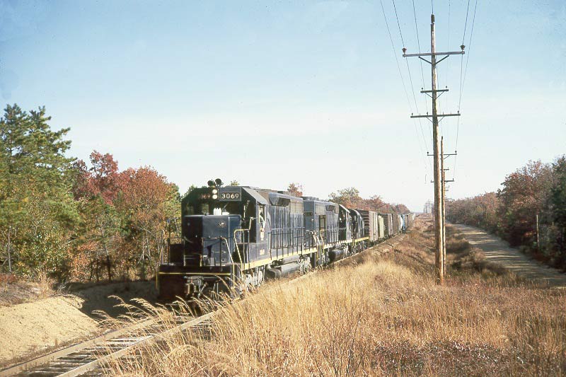 Former B & O SD-40 3069 leads JS-1 south near Ridgeway, NJ. This unit