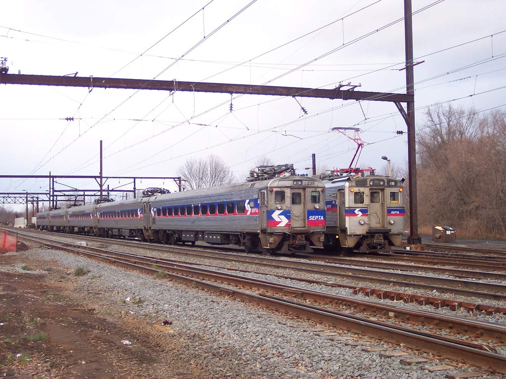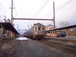 Three original Pennsy MU cars sit dead at the Septa West Trenton, NJ station having damaged pantographs caused by the high winds downing trees. February 19, 2011.