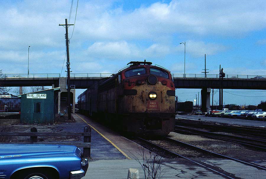 A Metra train in 1992. crossing the Sante Fe main at Joliet.