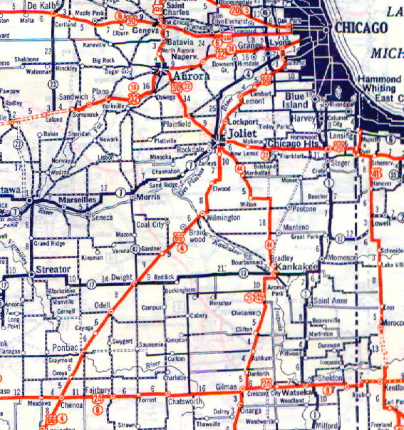 1930: US 66 re-routed around Joliet, IL on to modern I-55.