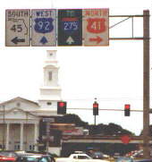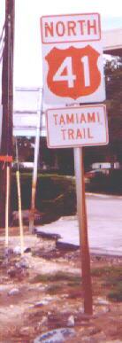 | Drive: US 41 never is on the same pavement as I-75, but the two roads are closely connected. I-75 stays within 27 miles of US-41 throughout Florida. The southern terminus of I-75 is only 14 miles from US 41. Through traffic on US 41 has been reduced to a trickle of its former volume, but US 41 still has heavy traffic in urbanized areas in its new primary use as an alternate route to I-75. The inter-urban sections are dotted by motels and old tourist traps. The old orange "I Survived US 41" bumper stickers from the late 1970's are a quickly fading memory on the old Tamiami Trail, which is still in common use term for US 41 from Tampa to Miami, featured below the route number as seen below, often along business routes as well. US 41 changes bannered direction in the Miami area, where it retains US 94's east / west desigantion. | ||