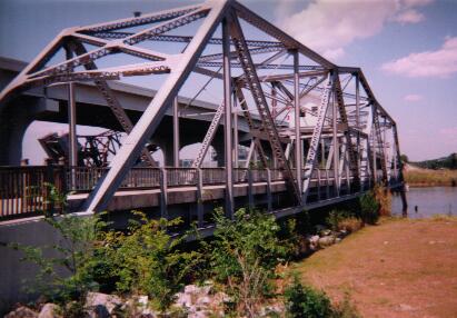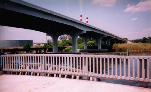 The new bridge, looking north from the end of the old bridge. You can still make a pavement stripe on the pier.