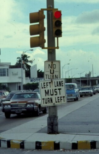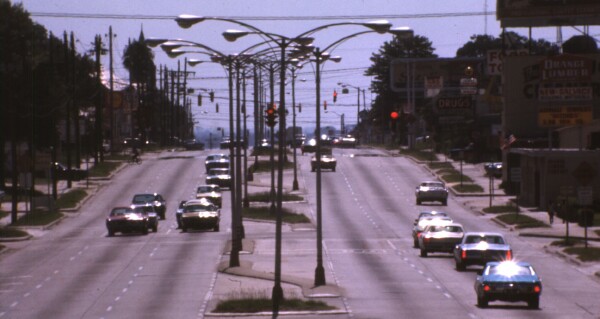 Along US 92 in Lakeland, FL in 1970, before the project to move the lighting to the sides of the road.
