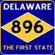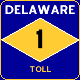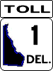 From David Kendrick : This shield uses the same blue and gold color scheme that Delaware already uses for supplementary signage indicating the limits of towns along routes. I have used black digits on the gold diamond for visibility and contrast. Delaware is formally called The First State, but it's also known as the Diamond State, and this design uses that element and also resembles somewhat the state flag (although I have used a darker blue than the state flag, more consistent with the city signs described above). It uses the same width of sign for two- and three-digit route numbers. (Note that in the "Toll" shield, the banner replaces the motto.)