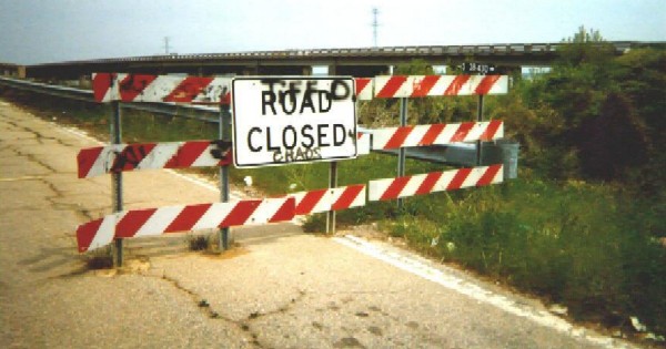 Looking south. On the far left is I-95 / US 15 / US 301. Straight ahead is Bass Ave (the old road). On the right is a concrete strip of a road that used to be a railroad right-of-way. The old pilings below and to the right are further evidence of the old rails. This might even be from an older highway bridge. (4/99)