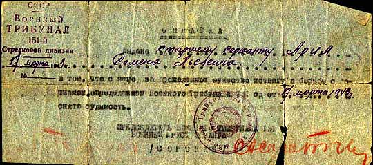 Given to Senior Sergeant Semion Lvovich Aria to certify that for the bravery and courage exhibited in fighting fascism his conviction is removed by the court martial of the 151st Rifle Division on March 17, 1943. Chairman of the military court Sorokin |