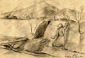 Telephone operator in the dug-out shelter. Author's drawing, February 1945. |