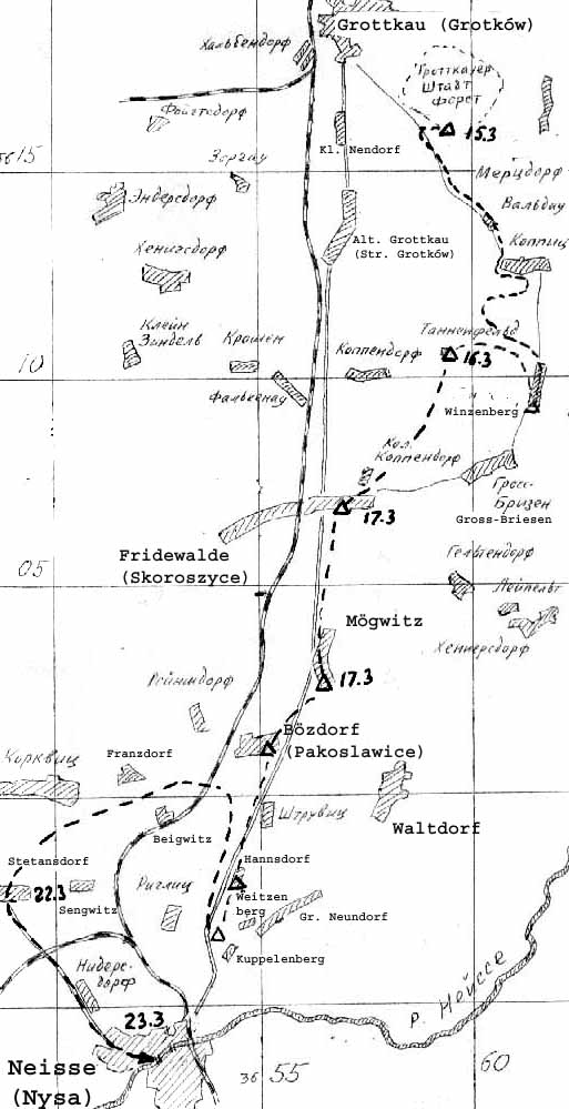 We bypassed Gross-Briezen from the north together with the infantry and armor, and came to the Grottkau-Neisse highway. Fridewalde stretched in a long stripe across the highway going south. We passed through the western part of that town, and captured Mögwitz by the end of the third day of fighting, on March 17.