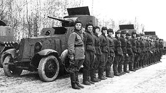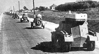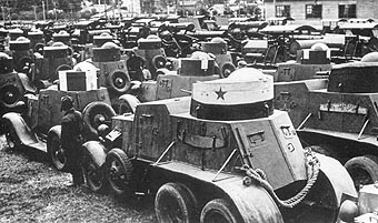![]() The column of BA-3 (on the front) and FAI armored cars. Maneuvres of the Kiev Special Military District. 1935. |